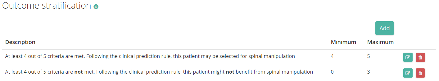 For this example a clinical prediction rule to identify patients that are most likely to benefit from spinal manipulation. The clinical prediction rule describes 5 criteria that have to be met. The criteria can be seen in the picture below: