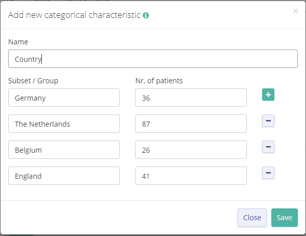 By clicking the Add button, a small pop-up will show in which it is possible to name the characteristic, add subsets/groups and note how many patients were in that group.Click to see an example.