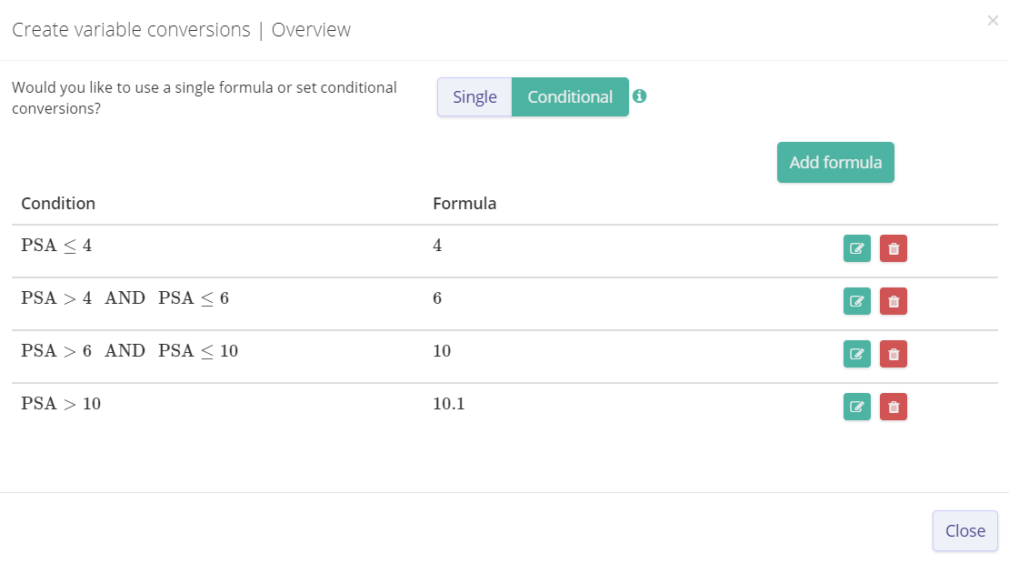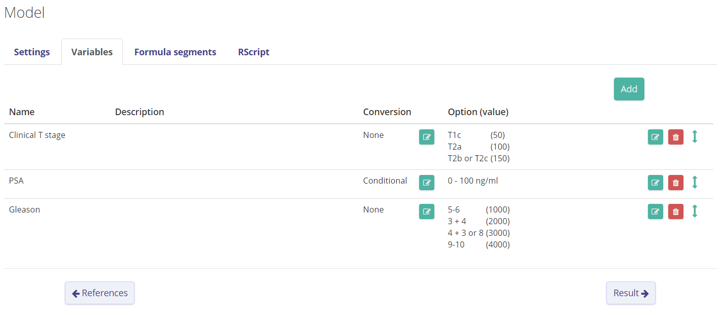 First we add the variables on Evidencio. See this screenshot on how the variables were added. The PSA value was added as a continous variable to simplify entering patient input in the model. Therefore, this formula was converted. See this screenshot to see the conversion.